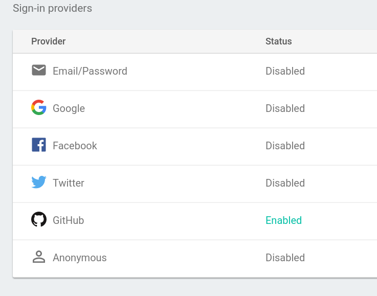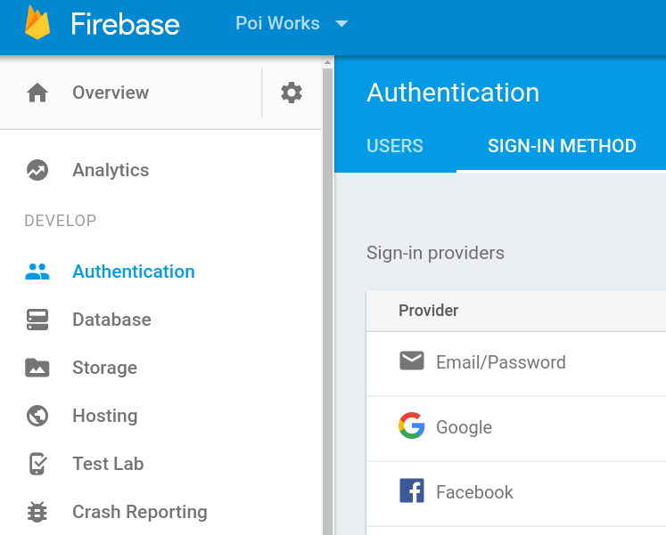 Firebase Authentication 不仅可以使用传统的邮箱密码验证,还引入了一些比较流行的身份提供商,例如:Google,Facebook 和 Twitter 等: